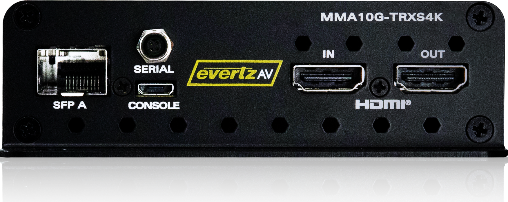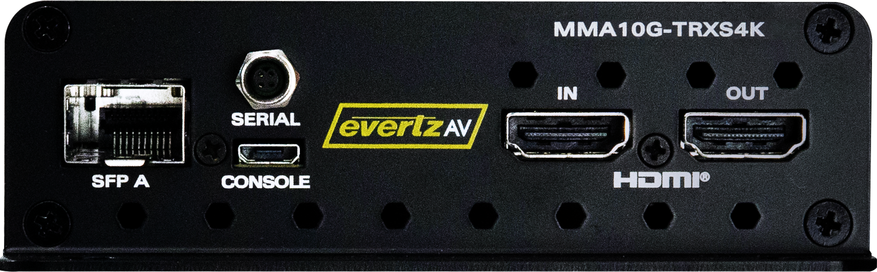 | MMA10G-TRXS4K | Standalone 4K60 10GE transceiver: single HDMI input, single HDMI output, RS-232/422 serial port, and SFP+ port |