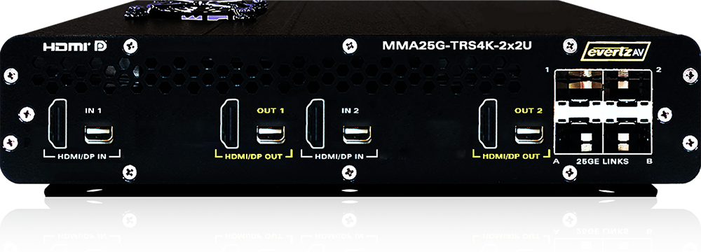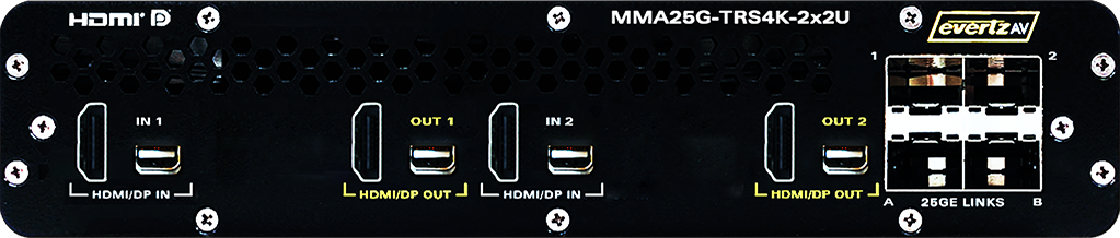 | MMA25G-TRS4K-2x2U | Standalone 4K/60 dual HDMI gateway with IPMX support: 2 HDMI/mDP inputs, 2 HDMI/mDP outputs, 3 HID device ports, 1 HID host port, 4 proprietary EvertzAV USB 2.0 ports, 2 analog balanced audio inputs, 2 analog balanced audio outputs, 2s/PDIF audio outputs, dual redundant 12V inputs, 2 25G SFP links, and Ethernet Control port. |