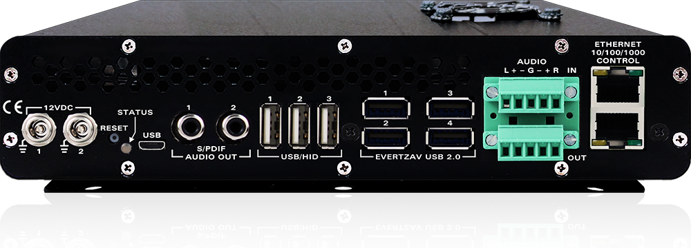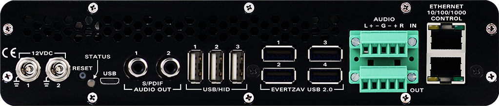 | USB | 3 HID device ports (type A) 1 HID host port (micro type B) 4 proprietary EvertzAV USB 2.0 ports (type A) |