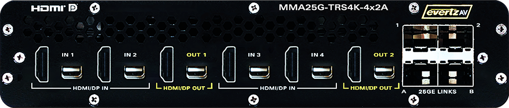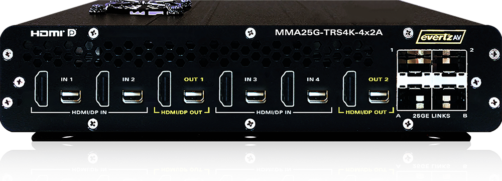 | MMA25G-TRS4K-4x2A | Standalone 4K/60 dual HDMI gateway: 4 HDMI/mDP inputs, 2 HDMI/mDP outputs, 3 HID device ports, 1 HID host port, 2 analog balanced audio inputs, 2 analog balanced audio outputs, 2s/PDIF audio outputs, Dante audio inputs/outputs, dual redundant 12V inputs, 2 25G SFP links, and Ethernet Control port. |