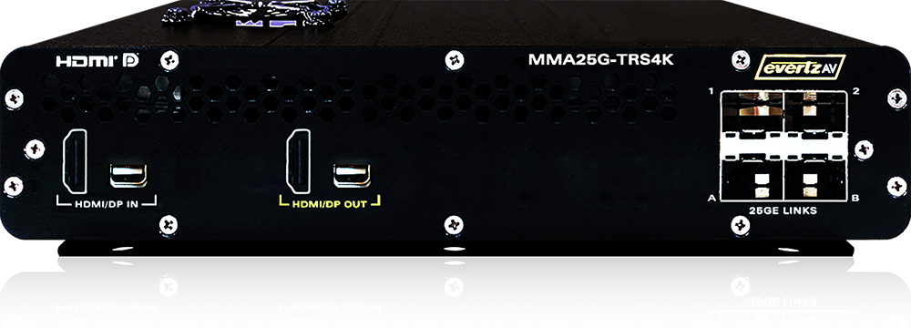 The MMA25G-TRS4K is a gateway that conforms to the emerging AV-over-IP open standard IPMX and, as such, complies with the suite of standards detailed in SMPTE ST 2110 and supports features such as JPEG-XS, AES67, and PTP. EvertzAV's line of IPMX-ready gateways provide synchronized, real-time broadcast-quality AV over IP while ensuring the ProAV interoperability requirements of today and tomorrow are met.