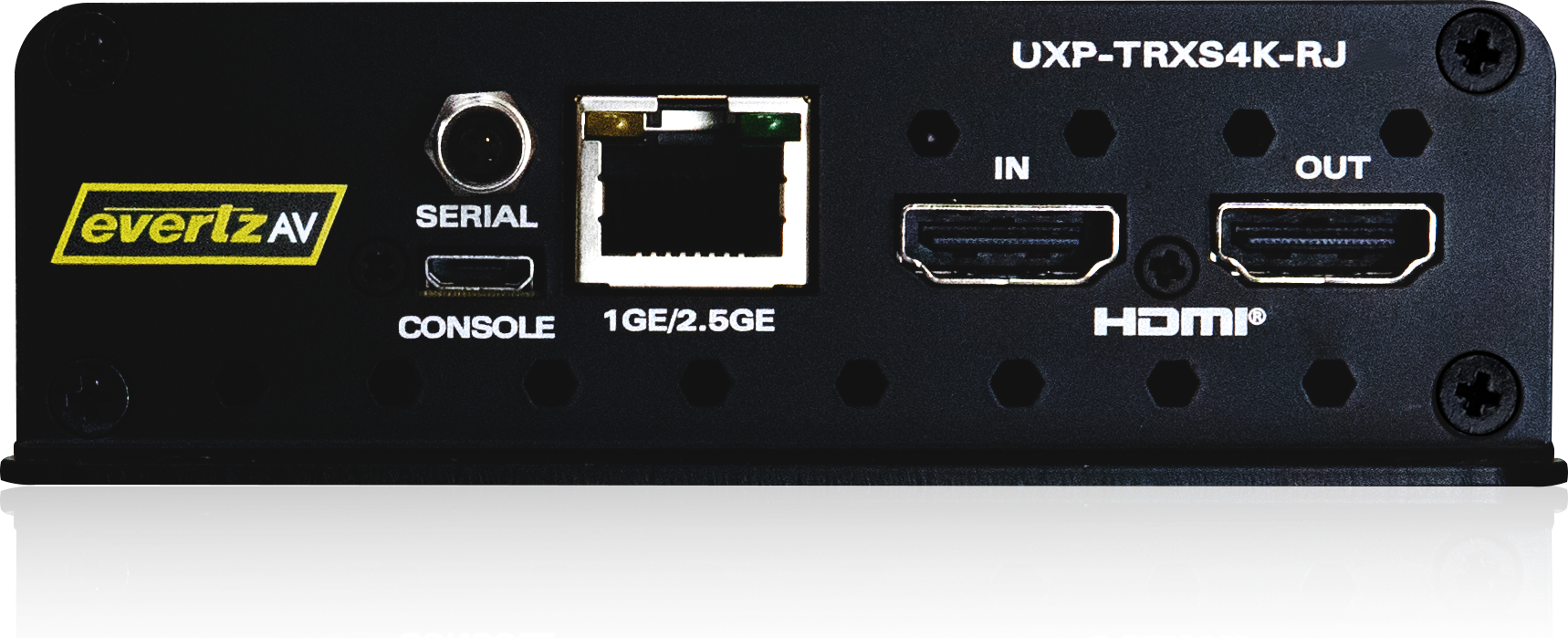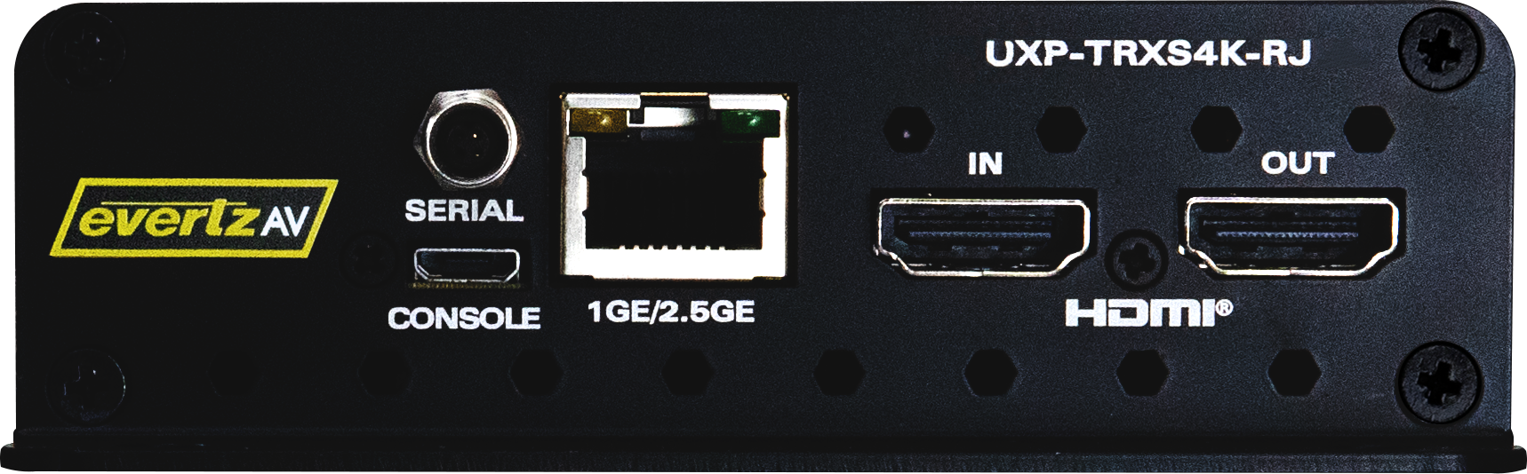 | UXP-TRXS4K-RJ | Standalone 4K60 2.5GE transceiver: single HDMI input, single HDMI output, RS-232/422 serial port, and RJ45 Ethernet |